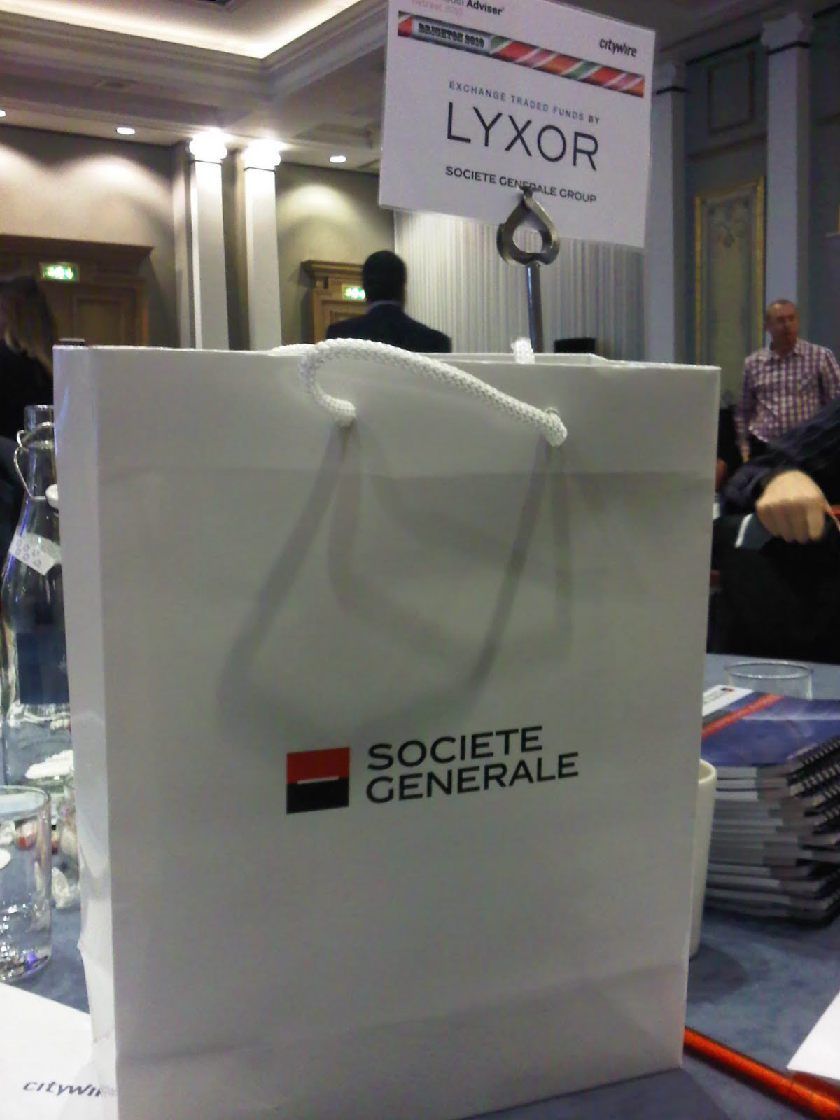 Lyxor, provider of the pictured bag gave a fascinating presentation on ETFs, ETNs and ETCs - A type of investment familiar to Green Financial clients in our passive model portfolios and a more and more frequently used fund type these days. But like anything, it pays to be aware of the detail - another reason why attending seminars such as this and being able to talk with individuals such as Alexandre Houpert, the Head of Listed Products for Northern Europe is so valuable. Alexandre is one of the people who construct the funds and associated products so chatting to him - and looking in the whites of his eyes - as readers of yesterday's blog will know, is an opportunity not to be missed.